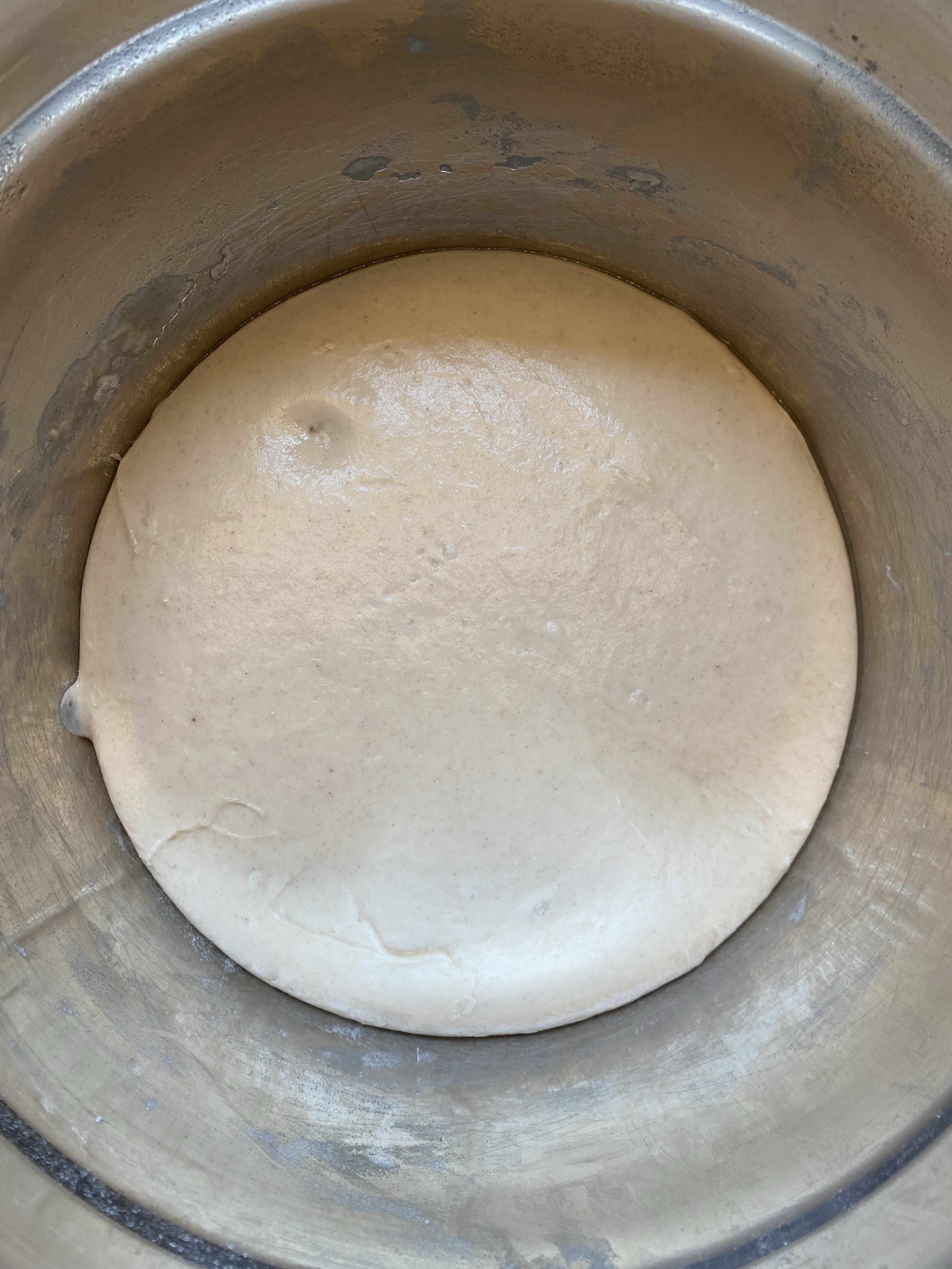 Meine Frischhefe war nicht mehr ganz frisch, trotzdem waren nach einer Stunde schon die ersten Gasblasen im Teig zu erkennen. Ein gutes Zeichen!