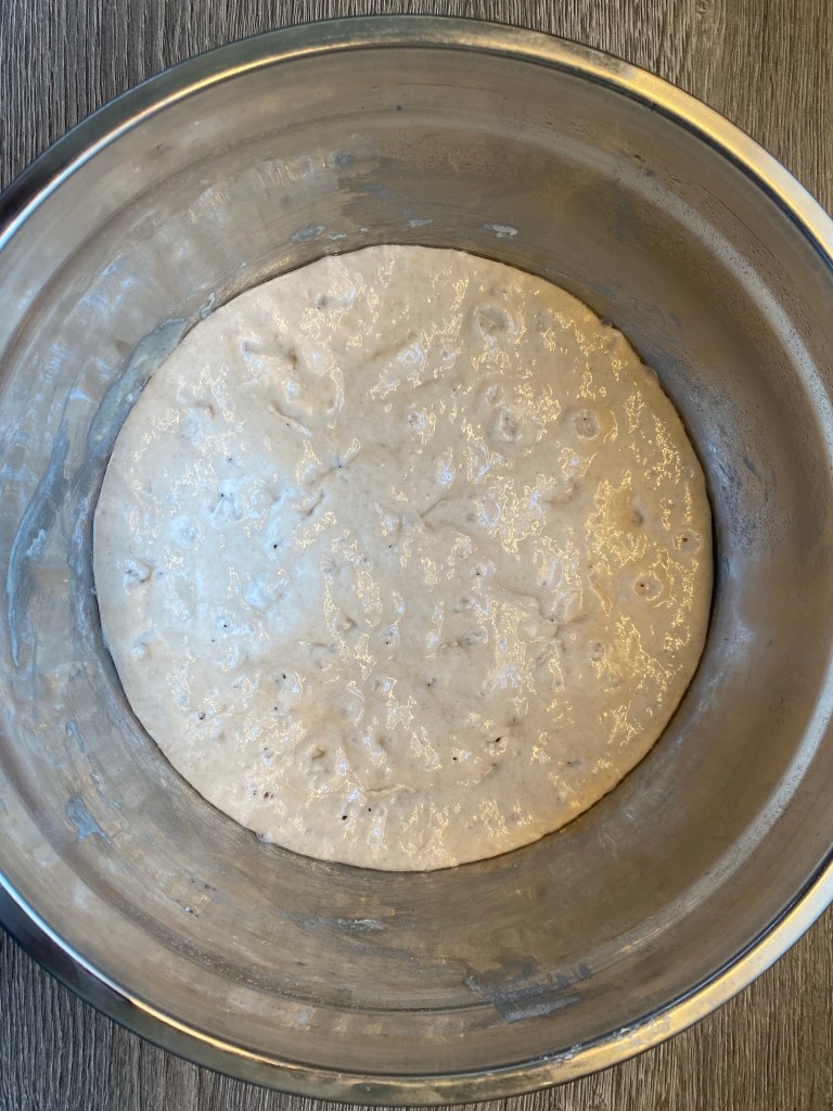 Anschließ ruhte der Teig 60 Minuten bei 24°C und wurde dabei alle 20 Minuten gefaltet und gedehnt.