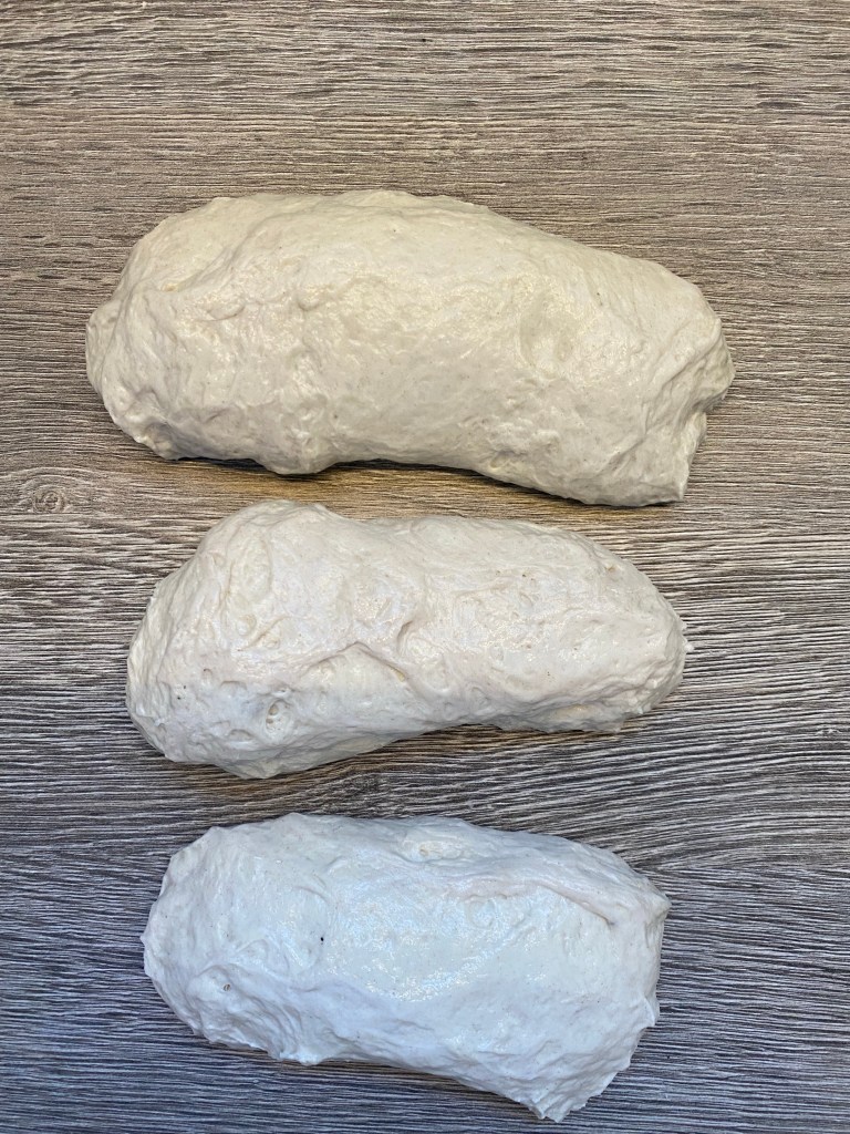 Die drei abgestochenen Teiglinge sind grob zu Zylindern verarbeitet worden und ruhten dann abgedeckt 15 Minuten. Ich habe den Teig nicht ausgestoßen, um das Gas im Teig zu halten.