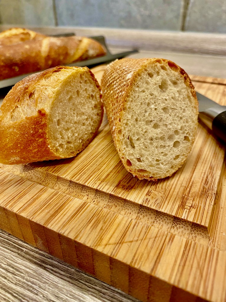 - Kürzeres Backen bei 250°: die Baguettes sind ein wenig zu dunkel geraten. Das Ziel sind hellere, trotzdem durchgebackene Brote